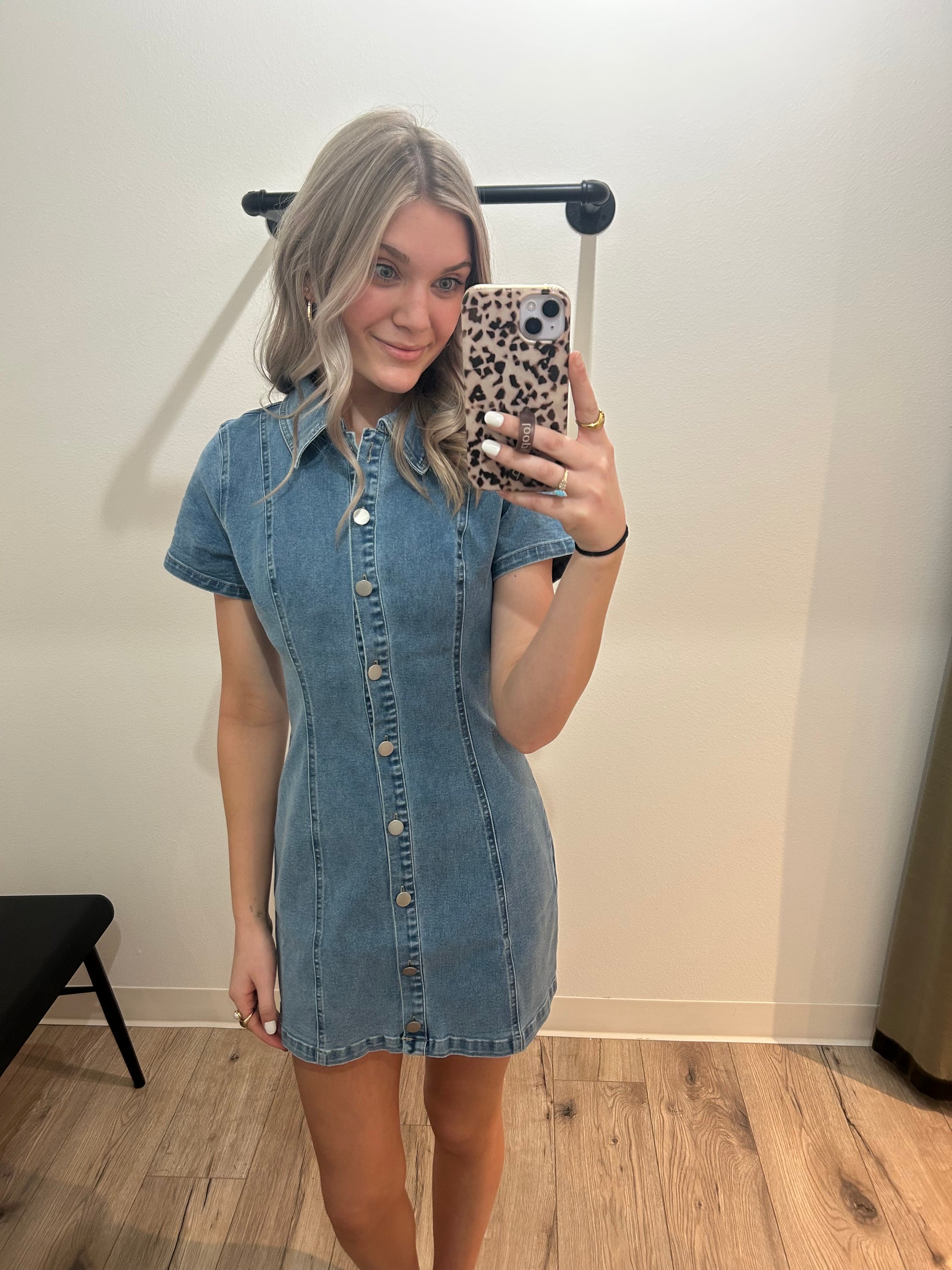 A classic denim mini with a flattering, structured fit you’ll reach for again and again. Featuring short sleeves, seam detailing that hugs in all the right places, and a full button-front closure. Easy to dress up with boots or keep casual with sneakers.