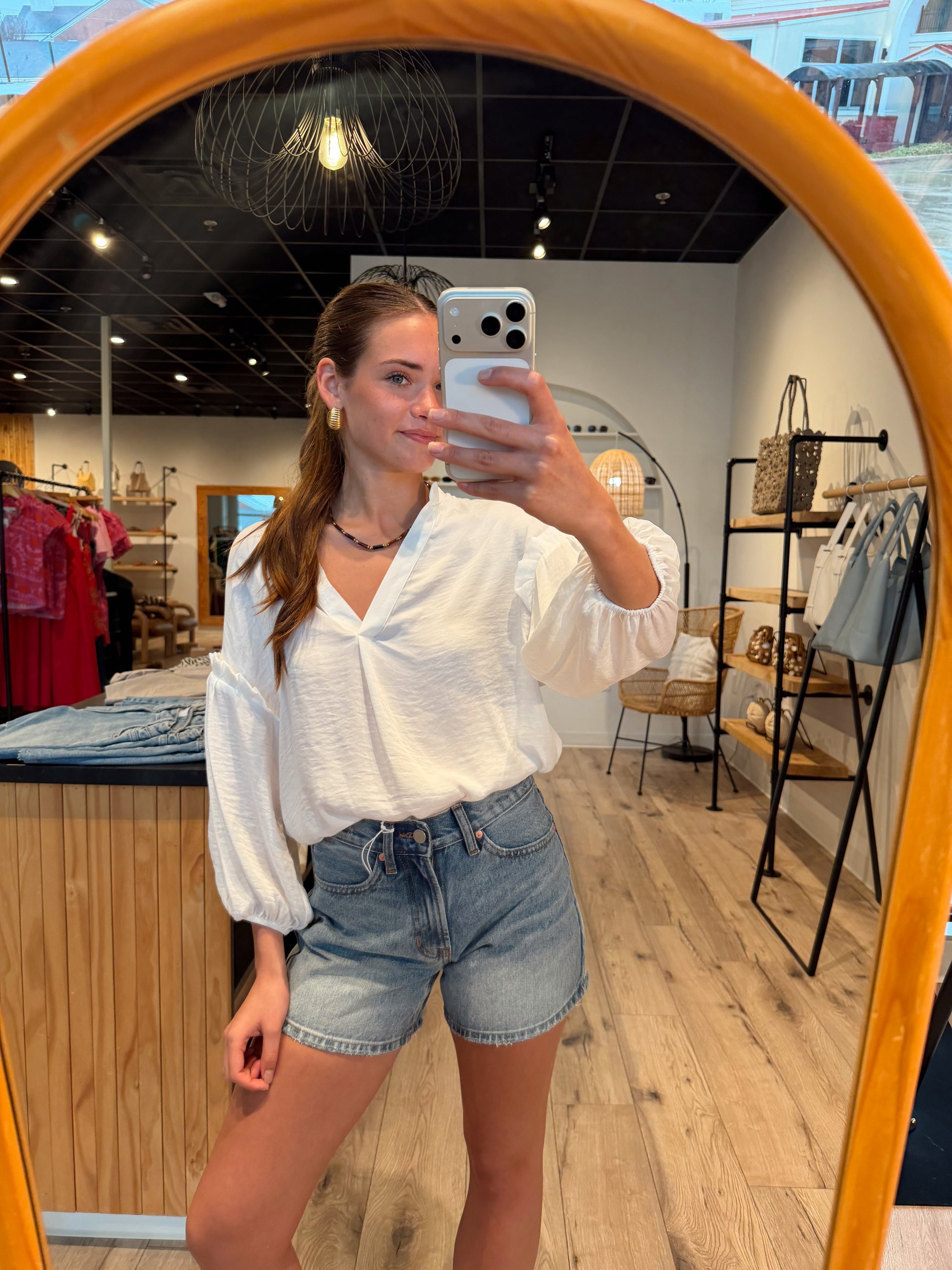 Chole Top an effortlessly chic blouse featuring a flattering v-neckline and statement ballon sleeves. Designed with soft lightweight fabric and subtle gathered sleeve details, this top is perfect for dressing up your favorite denim or shorts for an easy everyday look!