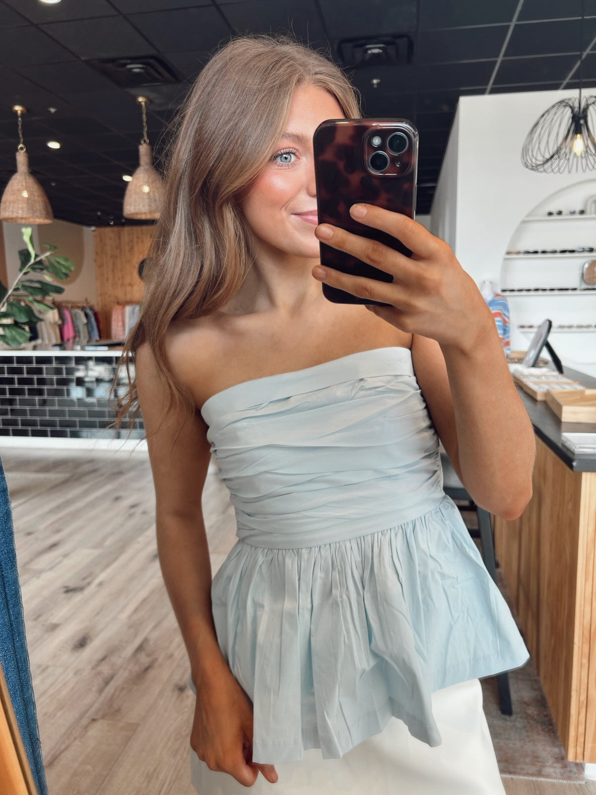 The Kenna Top is your effortless warm-weather staple. Designed with a flattering strapless neckline and soft ruching through the bodice, it flows into a lightweight, airy peplum hem that moves beautifully with you. The smocked back gives a comfortable, flexible fit while keeping everything secure. Available in classic white and soft blue, this top pairs perfectly with denim, trousers, or dressed up for a night out.