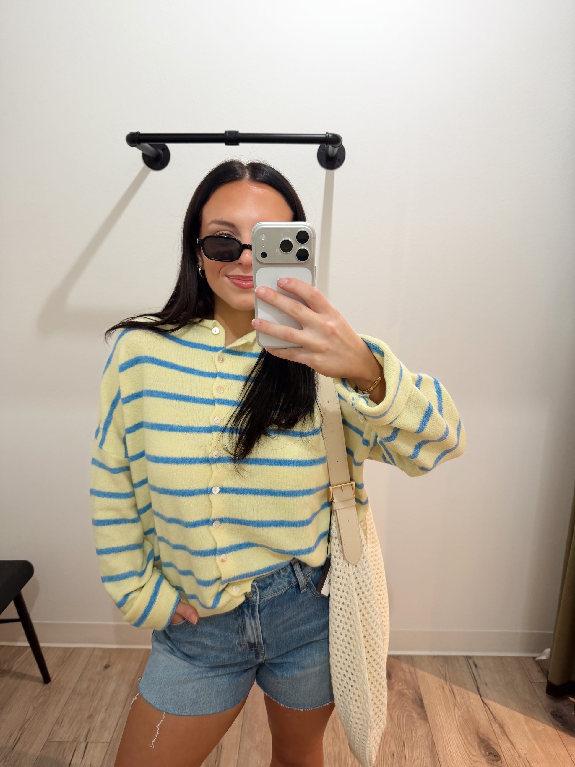 The Lizzie Cardigan is an ultra-lightweight garment featuring a striped design in butter and blue. Its lightweight fabric enhances breathability and comfort, making it suitable for transitional weather. The design allows for versatile layering, contributing to both functionality and style in various settings.