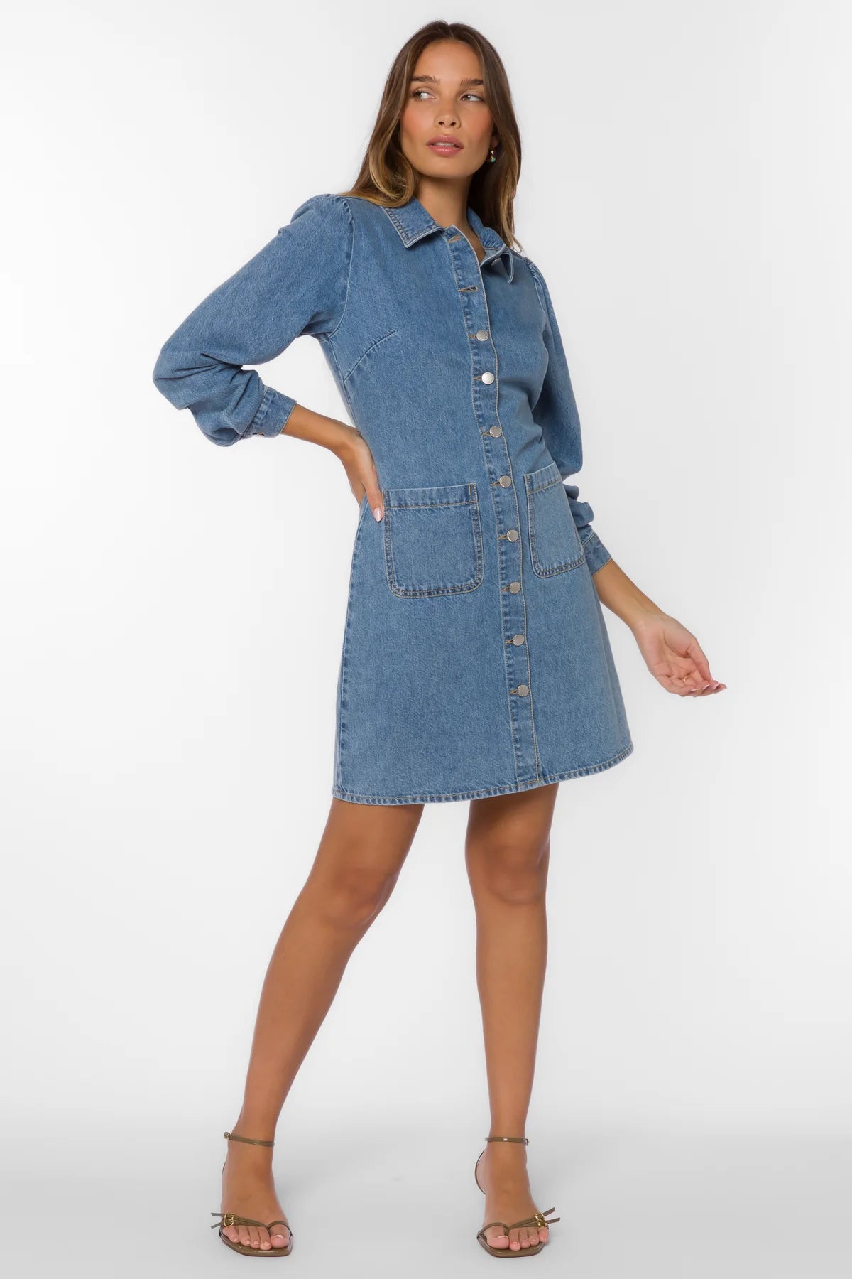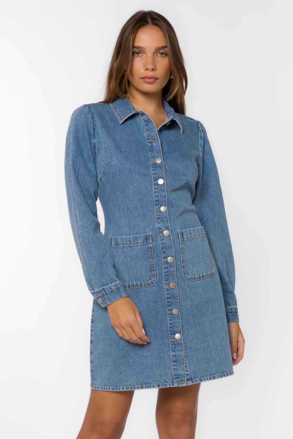 Our Sonja shirtdress is a classic in 100% cotton denim and features long sleeves with a slightly shirred shoulder detail, front patch pockets, brass buttons and tapered back seams for a slimmer fit.